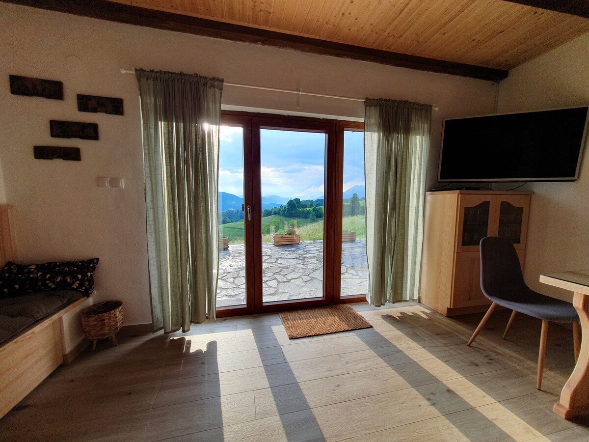 Pro dva dospělé a dvě děti. Obklopen lesy v nadmořské výšce 800 metrů. Prostorné venkovní dětské hřiště, relaxační zóna, gril. V přízemí domu (bez schodů). Má klimatizaci pro vytápění a chlazení, kuchyň, velkou jídelnu, TV, bezplatné WI-FI, koupelnovou sprchu, pračku. 50 km od hlavního města Lublaně. Zvířata vítána. Pěší turistika, cyklistika, mtb, E půjčovna kol Lyžování v Ski Cerkno (21 km daleko), nebo lyžařské centrum Stari vrh (32 km). Sauna - dodatečná platba, 20 €/hodina,