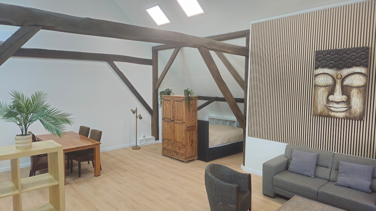 Prostorný apartmán s vlastním vchodem v centru Enter, rozložený v přízemí a 1. patře. You have access to a cooking unit, sitting/sleeping area, a sauna, fireplace and a private seat in the garden, surrounded by a number of fruit trees. Navzdory tomu, že je náš byt uprostřed centra, zažiješ oázu klidu. Po konzultaci je možné, že si uvaříš, zda je zajištěna snídaně.