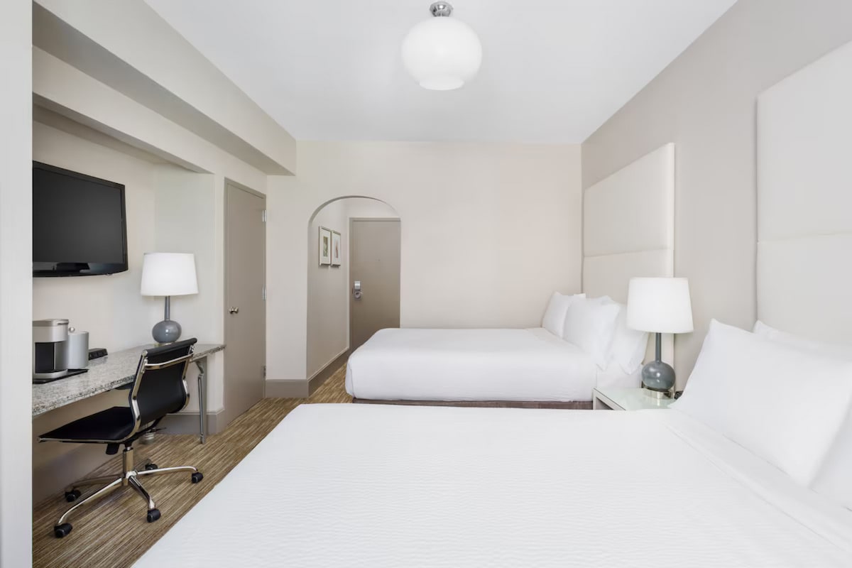 Pokoj se 2 manželskými postelemi velikosti Queen v divadle Dst