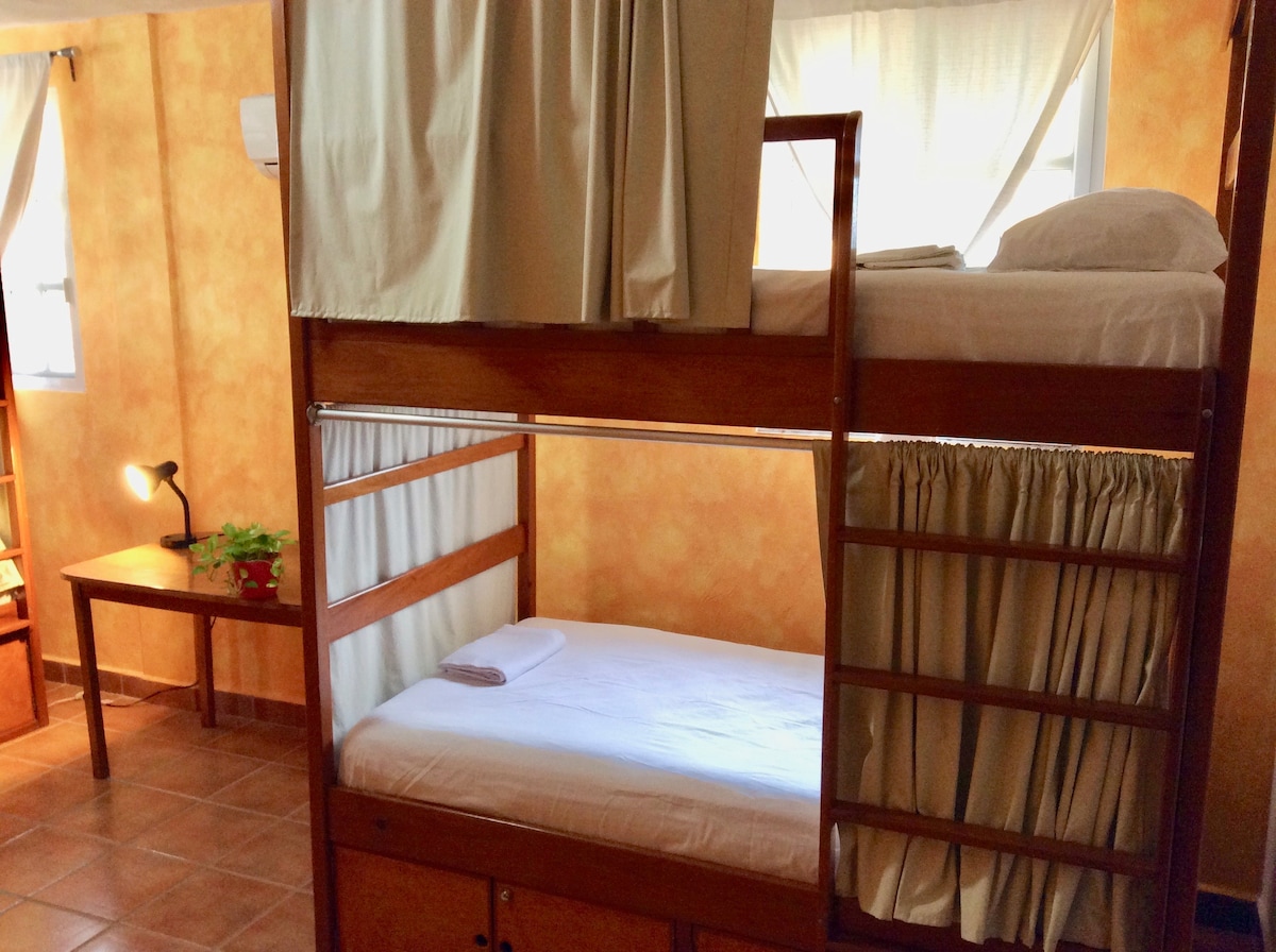Excellent choice for group of travelers: dormitory with capacity 4 to 5 people. Welcome students and travelers visiting Chetumal and surroundings. Clean Sheets and pillows, reading lamps and privacy curtains. Lockers, air conditioning, and Wi-Fi. Private bathroom inside bedroom, as well as to additional bathrooms available on first floor. Hot & cold water. Dormitory located at third floor, accessible via stairs. Does not include breakfast.