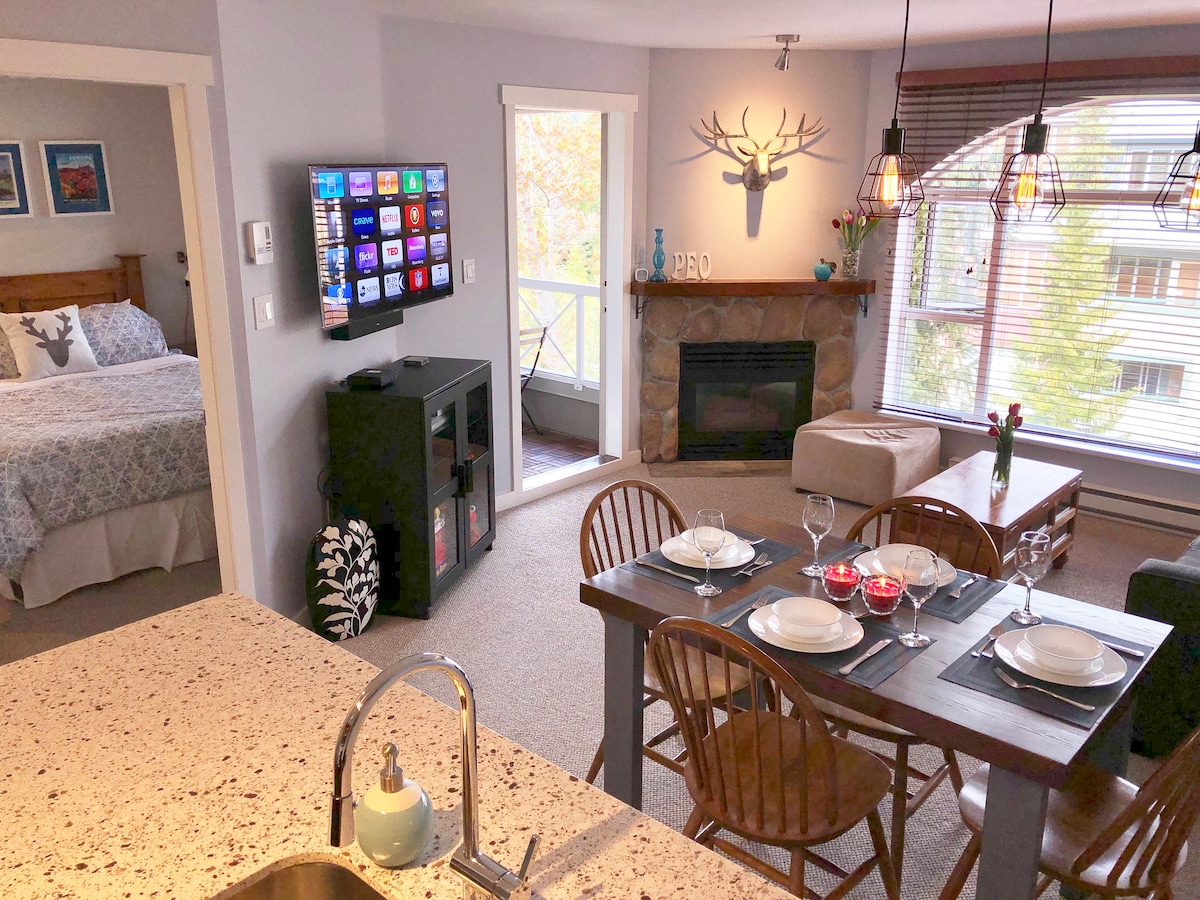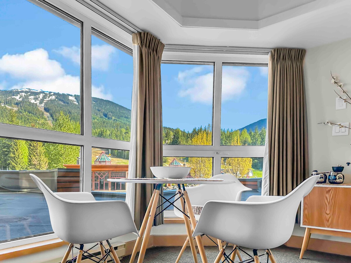Vítej ve své horské oáze. 1 minutu chůze od vleku Blackcomb! Náš moderní apartmán je světlý, prostorný, má 1 ložnici a okna po celém obvodu, která nabízí dokonalý výhled na stromy a hory. Při popíjení kávy u kuchyňského stolu se můžeš dívat přímo na horu Whistler! Apartmá má všechno: - manželská postel - rozkládací pohovka - plně vybavená kuchyň - napouštěcí vířivka - Keurig - Reproduktor Bose – centrální klimatizace – modernizovaná v červenci 2025 V budově je posilovna, prádelna, bazén a venkovní vířivka.