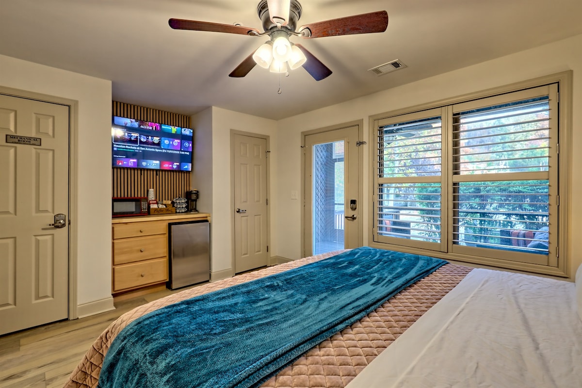 Experience the charm of Alpine Helen in this newly renovated, first-floor studio. Just a short walk to Main Square, restaurants, and shops, this stylish retreat offers the perfect blend of comfort, convenience, and upscale design for a memorable getaway. * 1st floor unit * Free parking * Steps from Helen’s Main Square * Newly renovated with upscale finishes * King size bed * Private patio for relaxing outdoors * Ideal for couples, small families, or a romantic escape