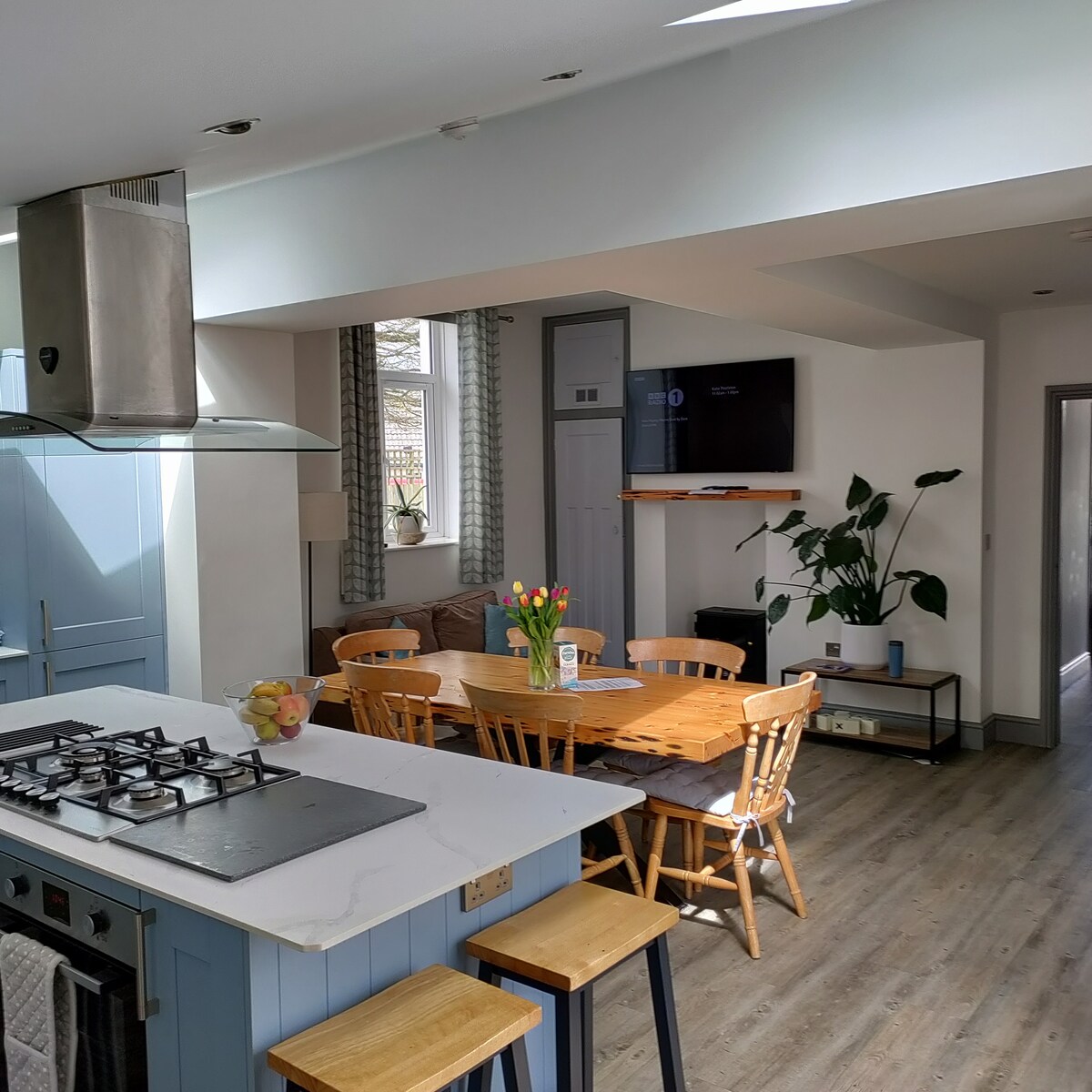 Tato malebná samostatně stojící stodola je plná charakteru a klidu (bez WIFI). K dispozici je otevřená kuchyň/obývací prostor s útulnou krbovou kamnou (dřevo je k dispozici za 7 liber v hotovosti) a snídaňovým barem s břidlicovou deskou. Nemovitost má masivní dubovou podlahu, s výjimkou břidlice v koupelně, takže si nezapomeň pantofle! Kuchyně je vybavena troubou, sporákem, lednicí s mrazákem, toustovačem, mikrovlnnou troubou a rychlovarnou konvicí. Útulný obývací prostor se otevírá na atraktivní terasu a travnatou plochu. Omlouváme se, ale domácí mazlíčci nejsou povoleni