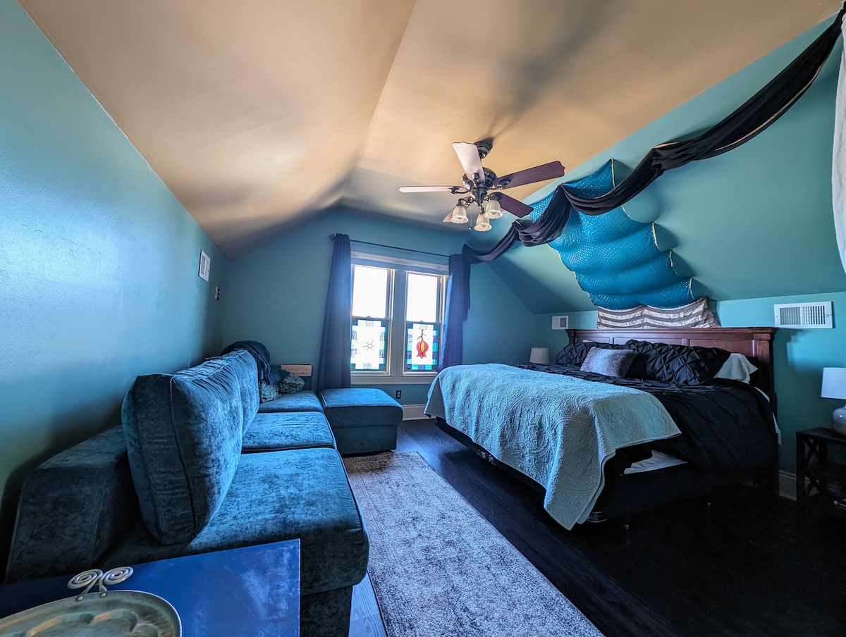 Vychutnej si bohatství tohoto historického viktoriánského panského sídla! Tento pokoj je pohodlný prostor s velkou načechranou pohovkou. Budeš spát v prostorné manželské posteli. Stůl umožní práci na dálku pro zaneprázdněného cestovatele. V pokoji je připojena vlastní koupelna se sprchovým koutem a vanou na nožkách. Dům se nachází přímo naproti Riverfront Parku a jen pár minut od Market Street. Je to jen kousek autem od vinic, starožitností a pěší turistiky.