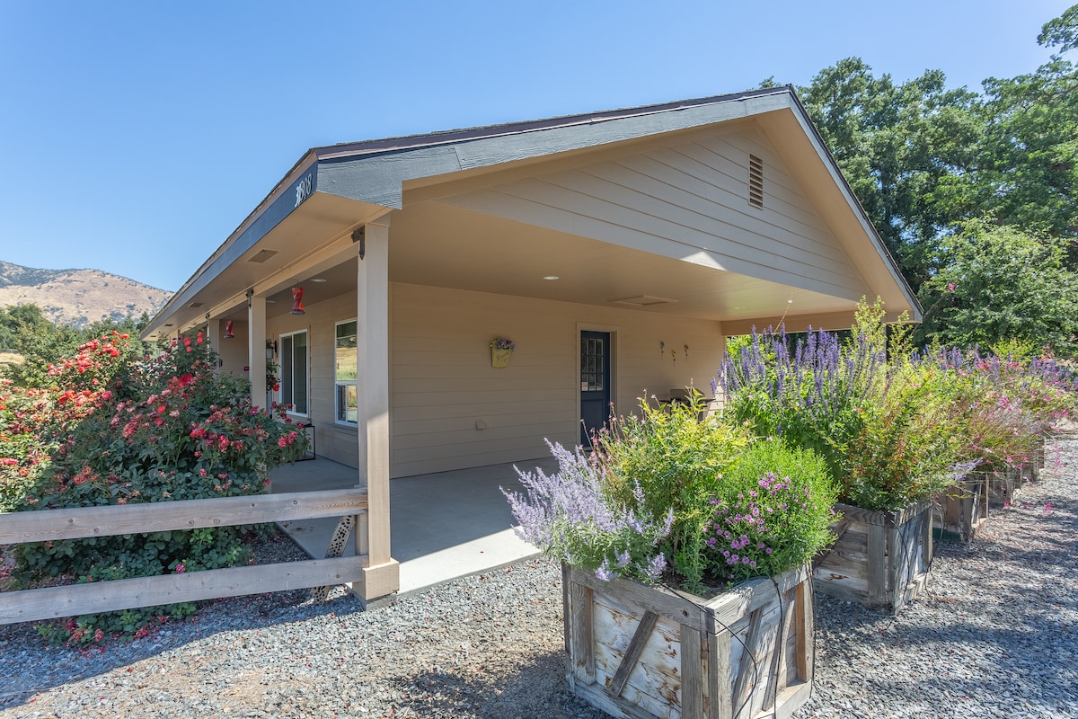 A spacious home with a country cottage feel. 2 bedroom, 2 bath home nestled in the Sierra foothills. 6 beautiful acres in a park like setting. Wrap around porch, outdoor bbq, hot tub, jacuzzi tub in master suite, outdoor gazebo, and so much more. Horses and dogs welcome. Private access to the entire 6 acres. Close to Kings Canyon /Sequoia National parks. Fresh eggs, bath bombs for the whirlpool tub, and a complimentary bottle of wine are just a few extras that will be provided.