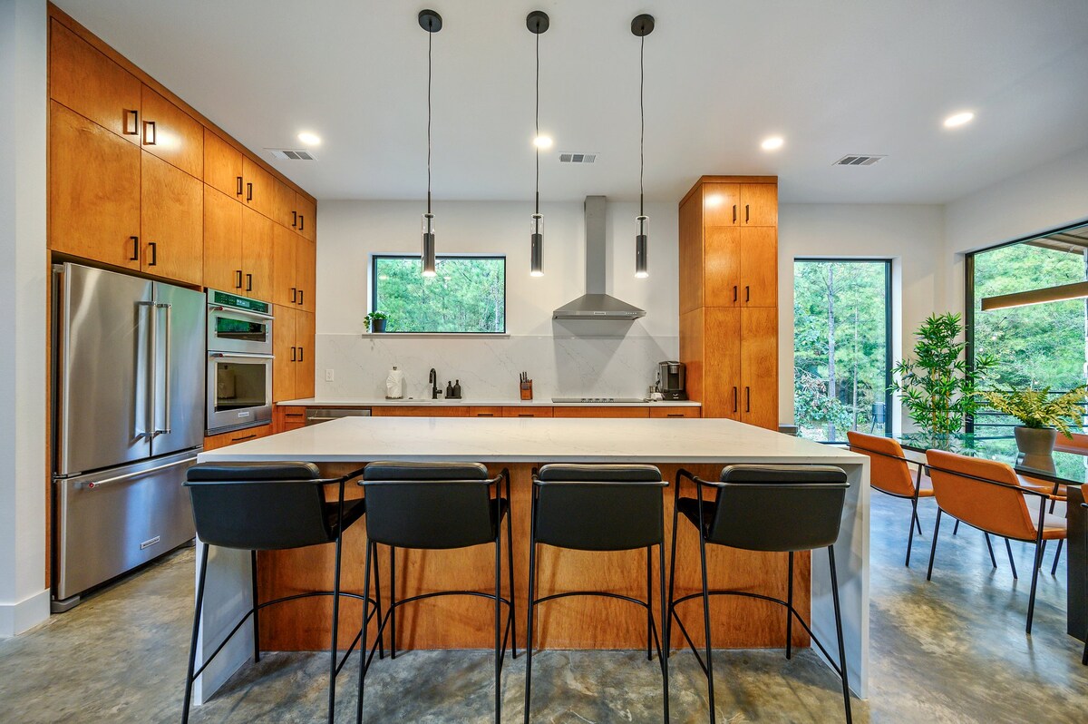 Moderní luxusní chata | 2 apartmány s manželskou postelí • Nabíječka elektromobilů • Vhodné pro domácí mazlíčky Objev The Modern – ohromující, designově vyspělou chatu na 3,5 soukromých akrech v Broken Bow. Vysoké 18stopé stropy, velká okna, celobílá kuchyně, kamna na dřevo a 2 luxusní apartmány s manželskou postelí (jeden s vanou). Užij si výhled do lesa, schouli se u ohně a nabij si elektromobil přímo na místě. Vhodné i pro psy! Rezervuj si nezapomenutelný pobyt ještě dnes.