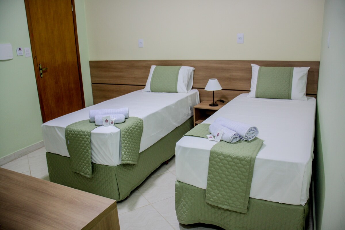 Acomodação projetada para comportar até 1 hóspedes com 1 cama de solteiro, TV, banheiro privativo, ar-condicionado, guarda-roupa, frigobar e amenites