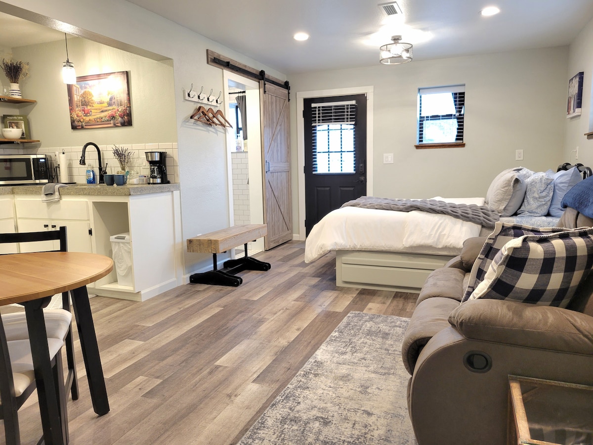 Unwind at The Honeysuckle Suite, a peaceful and cozy countryside gem. ☞ Plush queen bed with blackout curtains ☞ Reclining sofa ✭“The space was super clean, inviting, and stocked” ☞ Onsite washer + dryer ☞ Fully equipped + stocked kitchen ☞ A large tiled double-head shower ☞ Lg truck parking If you’re here to work, explore, or simply recharge, this hidden gem offers the comfort and quiet you’re looking for.