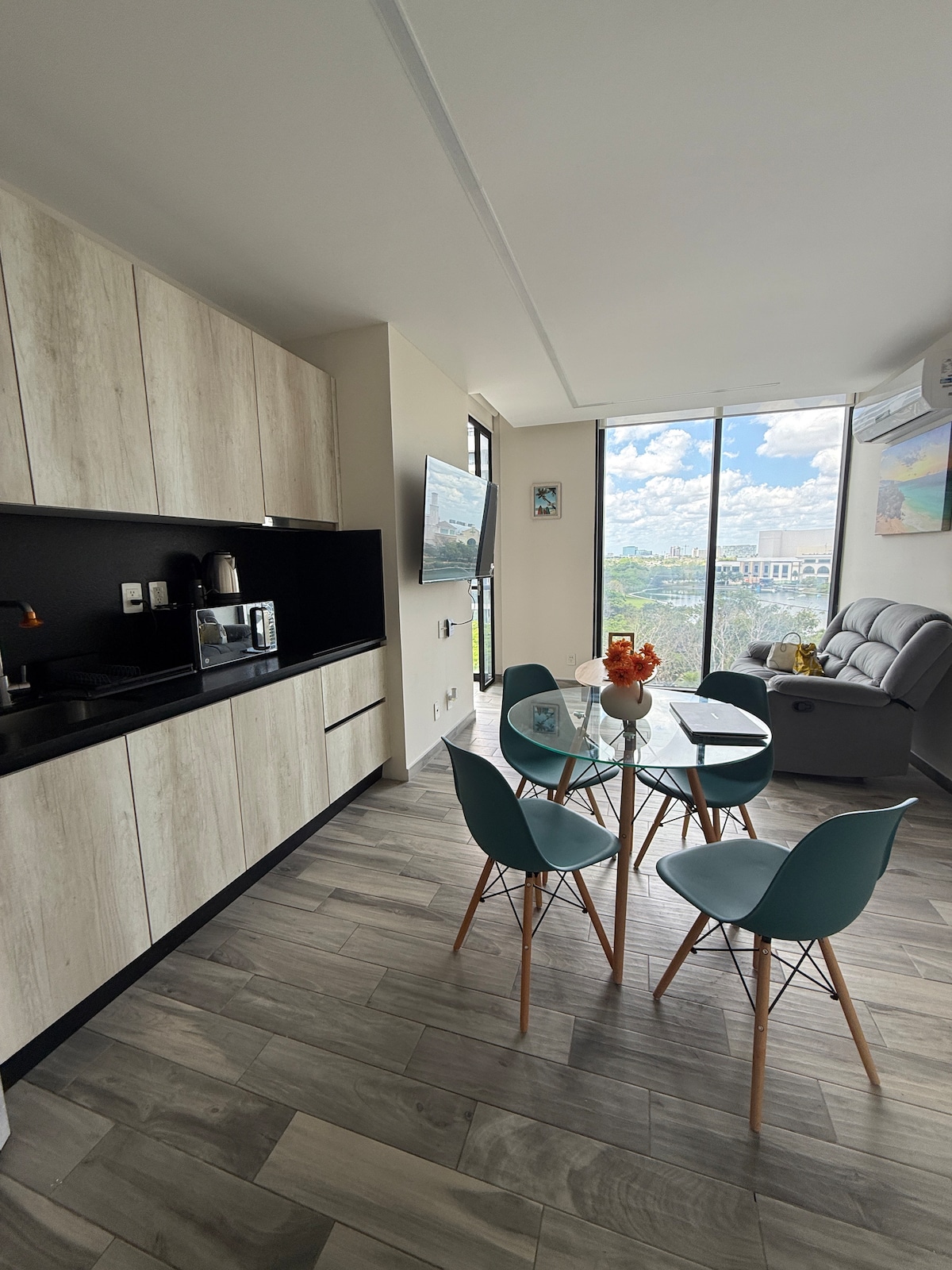 Modern studio with lake and tropical forest views in Mérida’s top residential area. Cozy and elegant, located in the north side of the city with a warm climate. Features a king bed (A/C), double sofa bed, equipped kitchen, and full bathroom with towels, hair dryer, and iron. Enjoy beautiful views and exclusive building amenities for a comfortable, memorable stay.