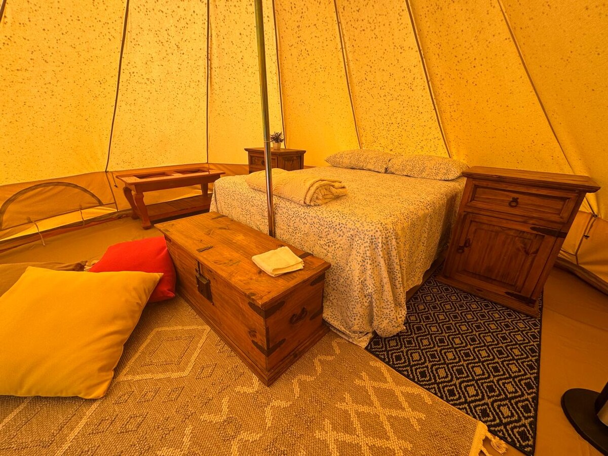 Okouzlující glampingový stan v přírodě s manželskou postelí velikosti Queen