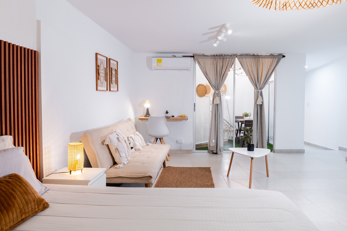 APARTMÁN 🌴 EXSTR • Granada 101 💃🏾🕺🏽 Tento krásný krátkodobý pronájem má výhodnou polohu jen jeden blok od nejlepší oblasti v Cali, Zona Rosa – Granada. Toto studio s jednou ložnicí a jednou koupelnou v prvním patře je ideální pro páry, sólo cestovatele a digitální nomády. It has hot water in all faucets, A/C, smart TV, and a high-quality queen bed. Navrženo tak, aby maximalizovalo pohodlí tvého pobytu: Úžasné výšky stropu, pohodlný nábytek, rychlé WI-FI, závěsy a výpadky proudu.