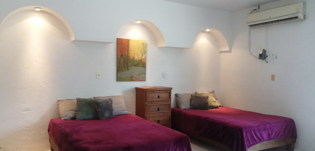FACTURO, Loft independiente, planta baja, bonita decoración ,1 cortina metálica como pared, 1 cama matrimonial para 2 Huésped y 1 individual 3er huesped , cuadro de ornato, 1 cajonera para ropa, espejo, baño con jabon, papel de baño, agua fría y caliente en frio, minisplit, frigobar , parrilla eléctrica, frigobar, trastes, vajilla, zona tranquila, excelente ubicación, centro, hospitales, restaurantes, centros nocturnos, central camionera, lavandería zonas Arqueológicas, playa.