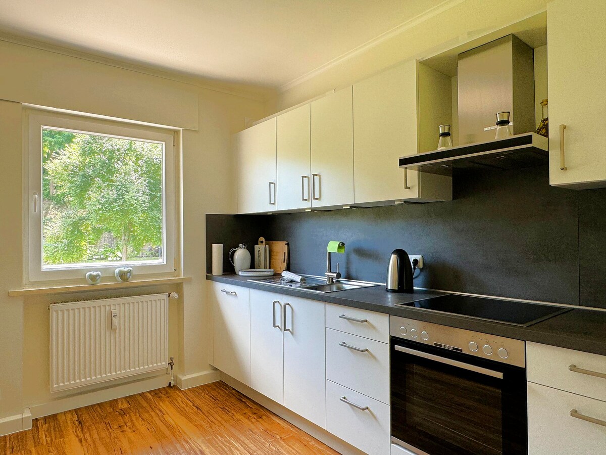 Byt v 1. patře byl kompletně zrekonstruován a má kuchyň s jídelním koutem, obývací pokoj s rozkládací pohovkou a Smart TV, ložnici s šatní skříní a manželskou postelí (200x200) a koupelnu. Jízdní kola lze zaparkovat v uzamykatelné garáži. Parkovací místa se nacházejí na břehu Mosely. V bezprostřední blízkosti se nacházejí restaurace, kavárny a obchody. Obchody s potravinami jsou vzdáleny 10 minut jízdy autem.