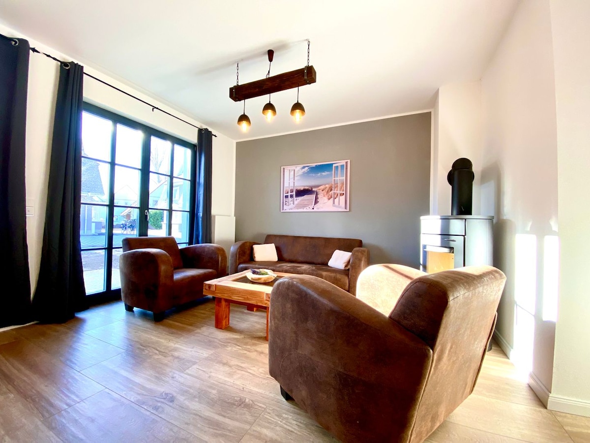 Láskyplně zařízeno v námořnickém stylu s designovým nábytkem na 3 podlažích. Internet přes optická vlákna. Obývací pokoj a kuchyň: Velký jídelní stůl, lavice, čalouněné židle, WZ Erker-Bar, vintage lednice, posezení, TV, krbová kamna. 1. pokoj: manželská postel, šatní skříň, koupelnová skříňka, relaxační koutek s lampičkou na čtení. 2. pokoj: manželská postel, designové noční stolky, posezení, velká televize, šatní skříň. 3. pokoj: rohová proutěná rozkládací pohovka, komoda, elektr. venkovní roleta. Prostorná sprchová vana v 1. patře. Sprchový kout v přízemí. Terasa