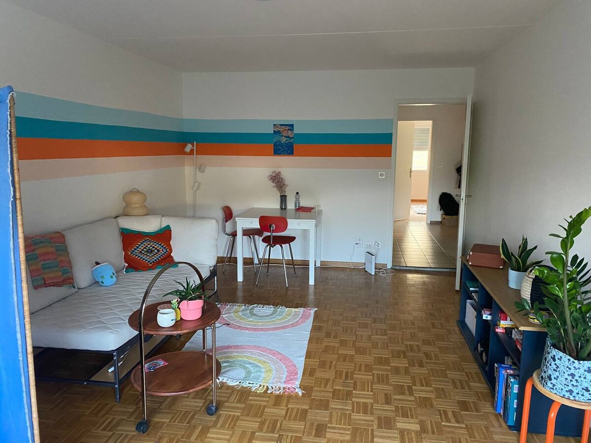 Pohodlně se usaď a odpočiň si v tomto tichém, stylovém prostoru ! Veřejnou dopravou se dostanete na vlakové nádraží Bern asi za 10 minut, zatímco vlakové nádraží Wankdorf je vzdáleno pouhých 5 minut chůze. Byt se nachází v klidné oblasti, přímo na okraji lesa a 600 m od Aare. Kromě toho se do Coop Pronto dostanete za pouhých 5 minut chůze nebo na Wankdorf Center/ Stadium za 15 minut!