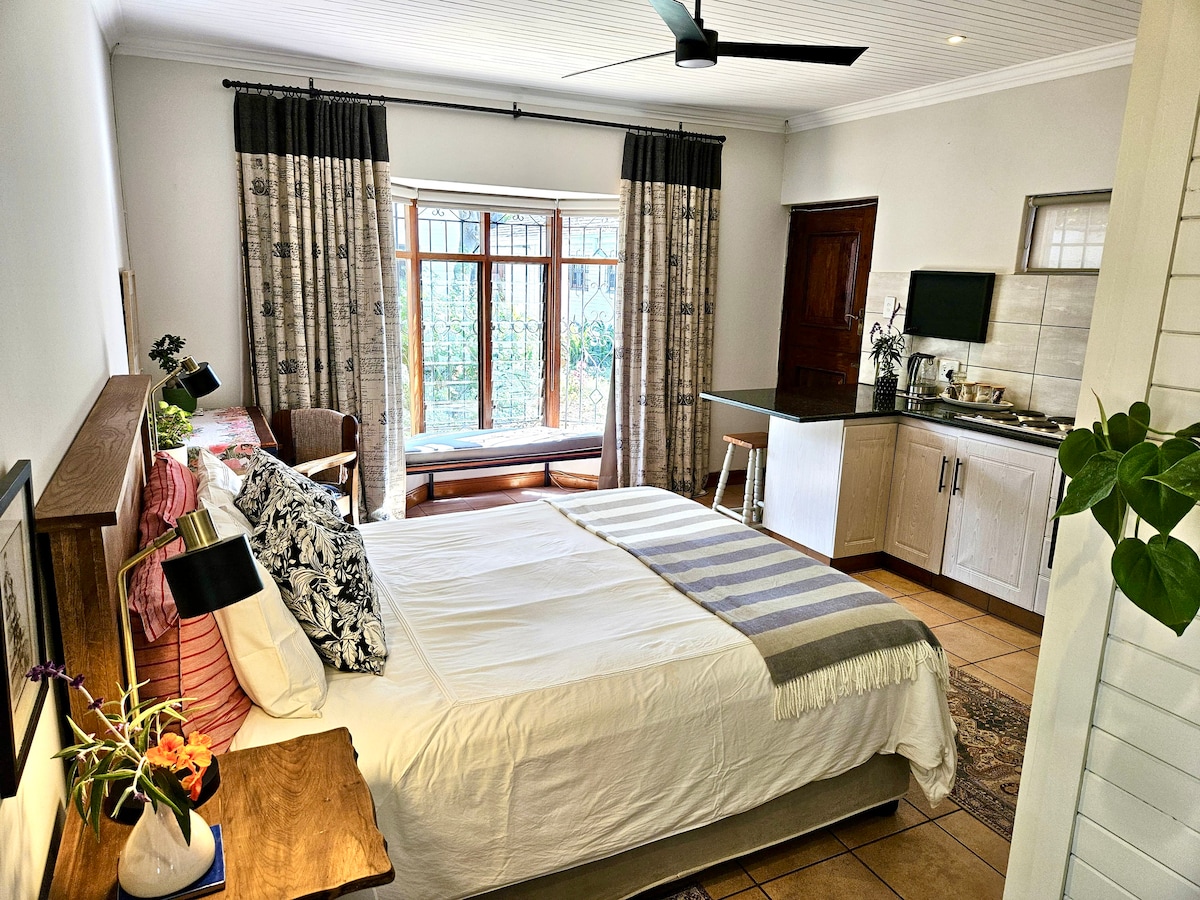 Natures Place is a 32msq studio cottage in Irene village, that has recently been renovated giving it a modern and cozy look and feel to it. The cottage is a compact but comfortable living space, with a well equipped kitchenette, and a covered carport for parking. Natures Place se nachází v domorodé zahradě plné rostlin, které přitahují více než 100 zaznamenaných druhů ptáků, a je útočištěm pro další malé volně žijící živočichy. Proto jeho název, „Natures Place“. Zpět a relaxuj v tomto klidném, stylovém prostoru.